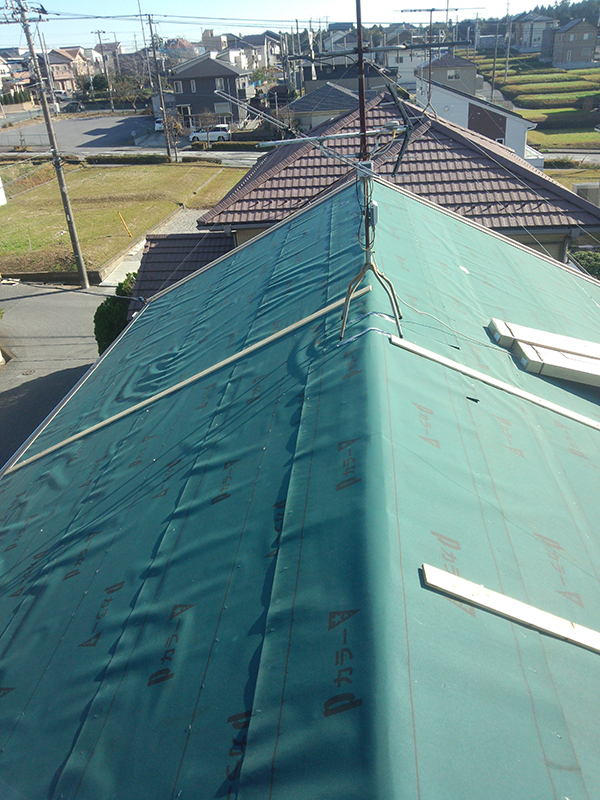 金属ルーフカバー工法で施工しています。『カバー工法』とは、既存の屋根はそのまま残し、その上に新しい屋根材を重ね葺きする方法です。 施工前、既存の屋根の上に、①下地を加工します。②防水シートを設置した後、③新しい屋根材を敷くことで完成です。