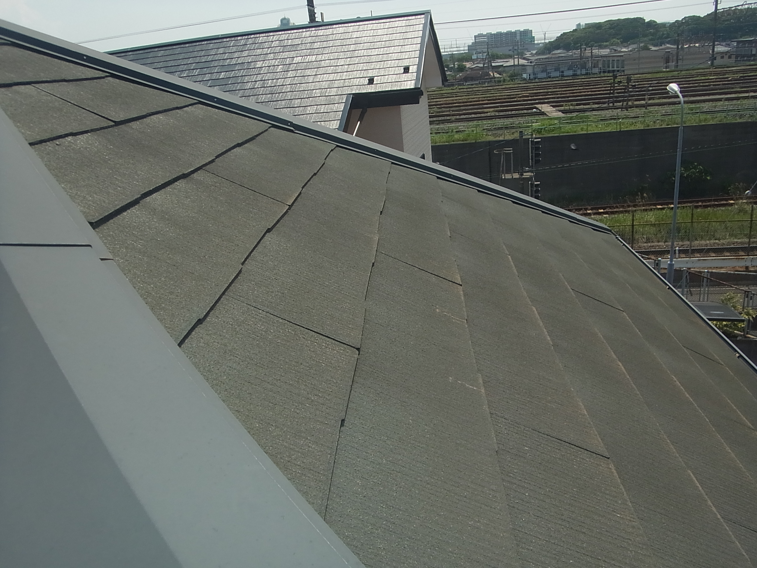 スレート屋根に、「ガイナ塗装」と呼ばれる染料を使用しました。別名「宇宙塗装」。スペースシャトルの表面にも使用さたものと同じ染料です。耐久年数が一般的な塗装より長いです。